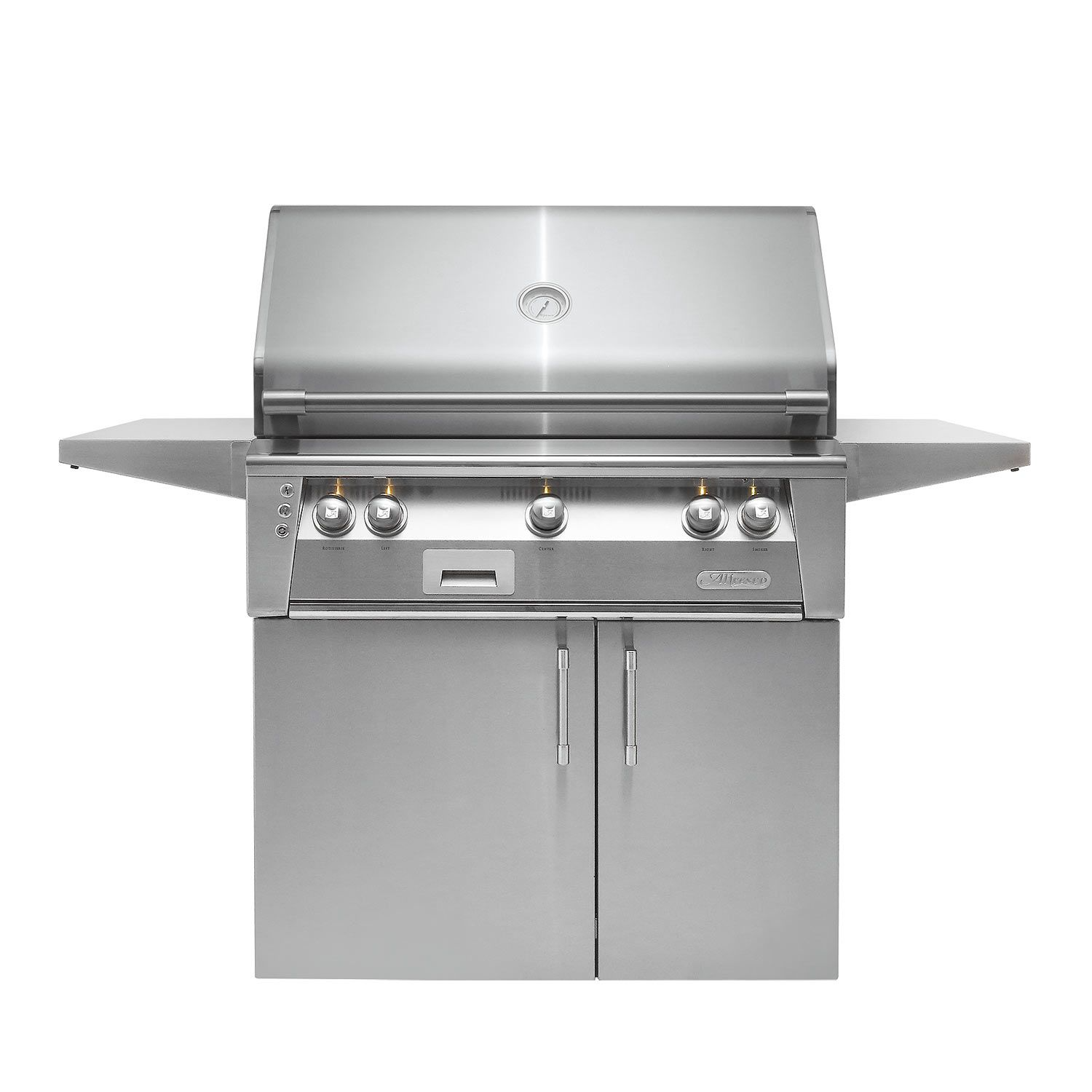 Alfresco ALXE-36C Freestanding Grill, 36-Inch provides a high performance luxury grill that is a terrific option to complete your outdoor kitchen. The 304 stainless steel grill features (3) 18-SR stainless steel main burners producing 82,500 BTUs with 660 square inches of grilling area with the option to upgrade to a Sear Zone infrared burner or dual side burner. The Sear Zone features a "V-shaped" design and reaches temperatures up to 1500°F to produce professional steakhouse results using up to 50% less fuel. Above the burners, the pyramid-shaped ceramic briquettes eliminate hot and cold spots to maximize flavor as they evenly deliver heat to the cooking surface. The premium cooking grates have a special nonstick electro-polished finish, to achieve professional grill marks every time. The heavy-duty stainless steel cart allows for additional storage with a choice between double doors or the deluxe door and drawer combo.Read More