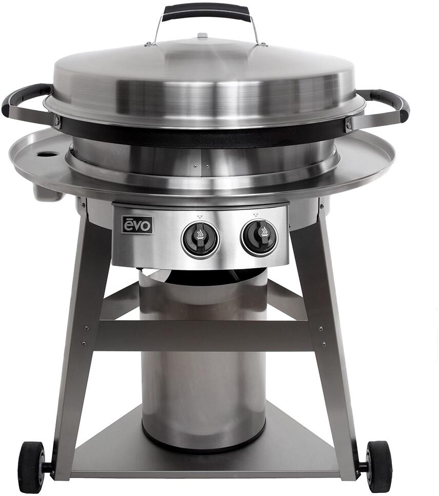 The Evo Professional Wheeled Cart has a 30” (762mm) diameter black seasoned steel cook surface heated underneath by inner and outer gas tube burners. Surface temperatures range from 225ºF to 550ºF (121ºC to 288ºC) from the center to the outside edge. A stainless steel drip pan completely surrounds the underside of the cook surface catching all food debris. The Professional Wheeled Cart is the ideal grill for creating a social cooking space on your patio or deck. Available with either Natural Gas or LP Propane.Read More