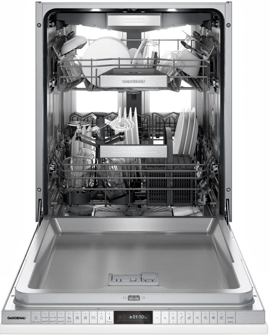 Gaggenau 400 Series 24" Panel Ready Top Control Built In Dishwasher features optimal protection for sensitive glassware, flexible basket system, illuminated interior, push-to-open function, and a flexible hinge for reduced toe-kick height. *CUSTOM PANEL & HANDLE SOLD SEPARATELY*Read More