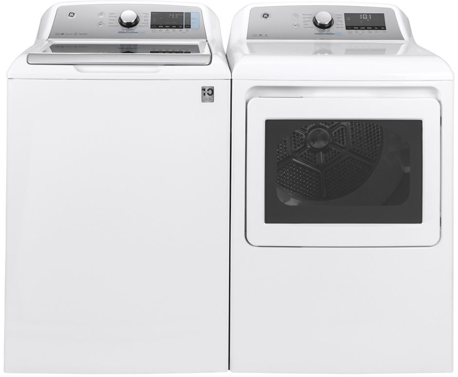 GE® White Top Load Laundry Pair with a 6.0 cu. ft. capacity washer and 7.4 cu. ft. capacity electric dryer.Read More