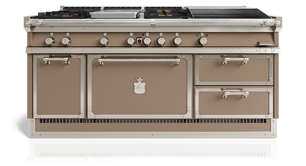 The substantial OGS188 model boasts considerable space and versatility due to the range’s ability to add 24″ cooking elements. Measuring 74″ wide, the cooktop can be divided: one half dedicated to preparing pasta and similar dishes on the burners and coup de feu, while the other side is perfect for cooking meat and fish on the burners and frytop. Only one oven is featured in the following version, but a second oven can be added to enable different dishes to be cooked at the same time.Read More