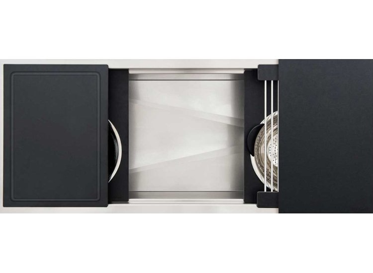 Our matte black Graphite Wood Composite material perfectly complements a contemporary, transitional, or traditional kitchen design and looks wonderful with a wide range of cabinet and countertop colors. This high-performance, dense material is only 1/2 inch thick, is gentle on your knives, and is easy to clean in the Workstation or in the dishwasher.Read More